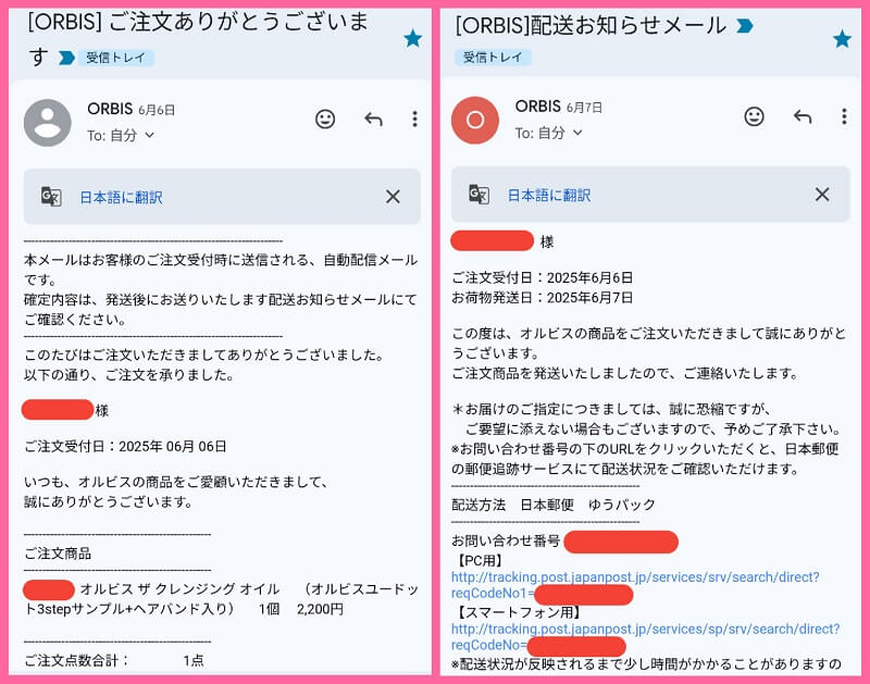 オルビス ザ クレンジングオイルの配送お知らせメールには、本文に配送業者と商品の追跡番号が書かれており、ヤマト運輸もしくは日本郵便から発送されます。