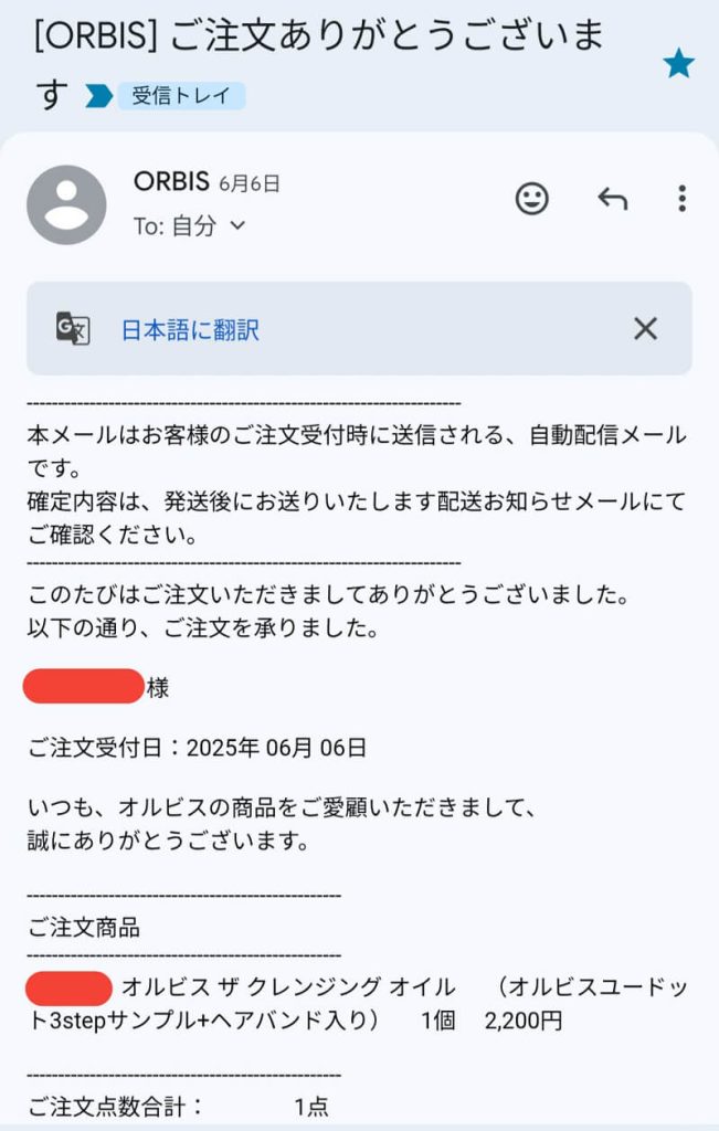 オルビス ザ クレンジングオイルを注文すると、注文が完了した後にはまず「注文確定メール」が届きます。