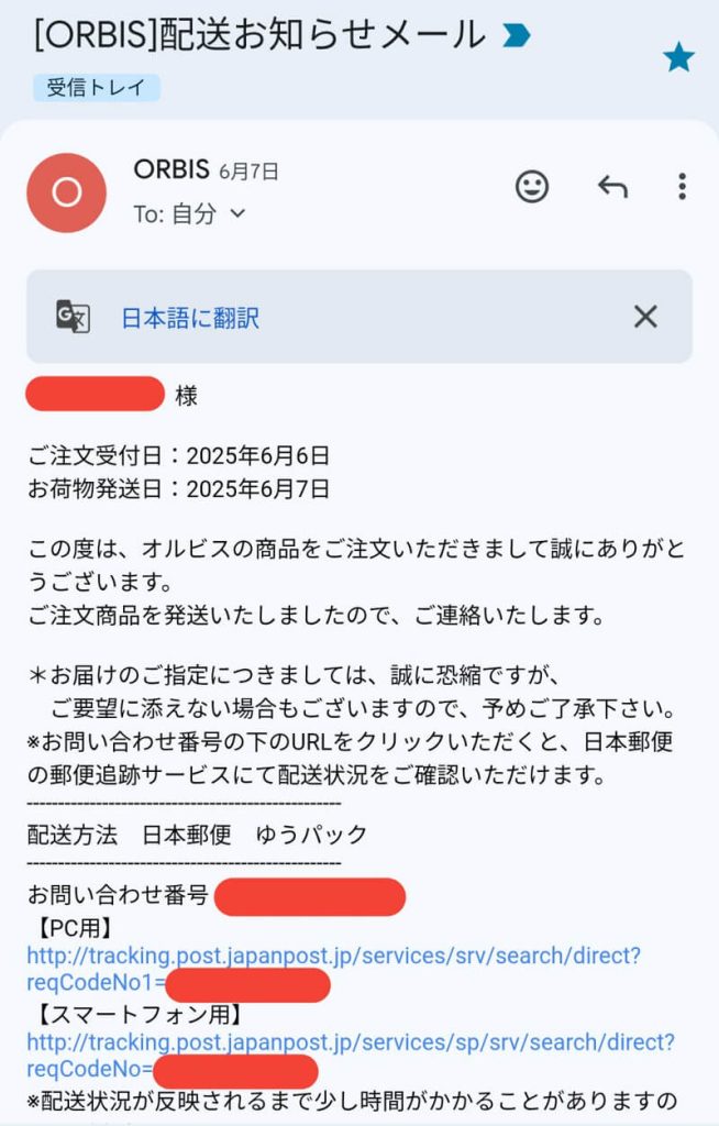 オルビス ザ クレンジングオイルの配送お知らせメール本文には、商品の追跡ができる追跡(お問い合わせ)番号が書かれているのでとても便利ですが、このメールがなにかの手違いで届かないことがあります。